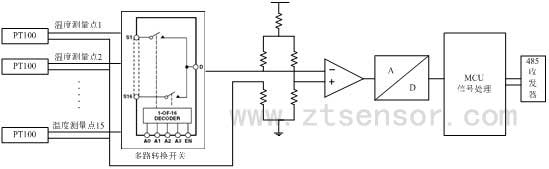 使用体积小、重量轻的铂电阻(Pt100)作为温度敏感元件,利用大规模集成多路转换开关分时选通每路温度信号,然后通过高速模数转换器将模拟温度信号转换为数字信号。通过单片微处理器MCU将信号进行数字滤波,线性校正,偏移补偿,最终通过RS485总线将温度数据以指定的帧格式传送出去。